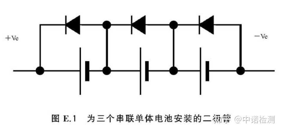 ——使用旁路二極管限制每個(gè)單體電池極性接反時(shí)的電壓。例如,對(duì)于由三個(gè)單體電池串聯(lián)連接組成的電池組提供的保護(hù)電路如圖E.1所示。