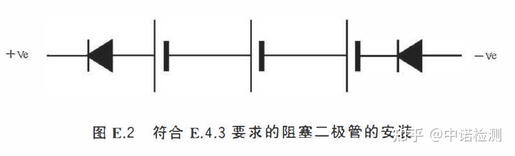 ——采用GB/T 3836.3 規(guī)定的電氣間隙和爬電距離僅將電池和其他電源隔離,但是安裝有如圖E.2 所示的阻塞二極管,可降低由兩個(gè)二極管短路引起的單個(gè)故障危險(xiǎn) 。
