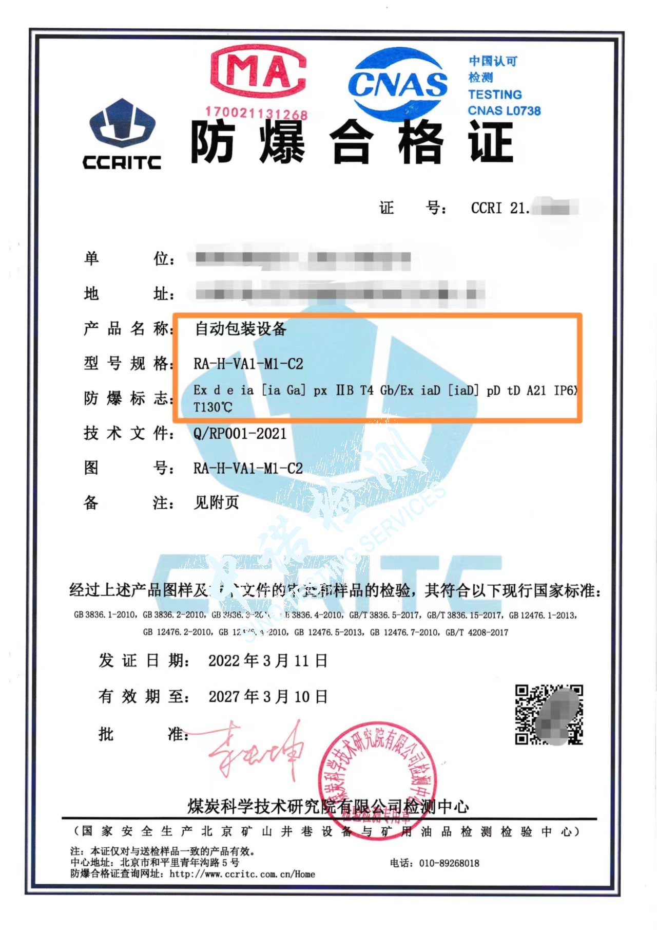 自動(dòng)包裝設(shè)備防爆合格證辦理