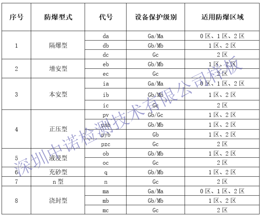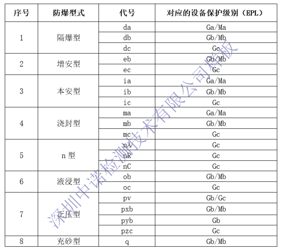 二、防爆保護(hù)型式,即設(shè)備采取的防爆保護(hù)措施,防爆保護(hù)型式以及對(duì)應(yīng)的代號(hào)關(guān)系見(jiàn)下表。